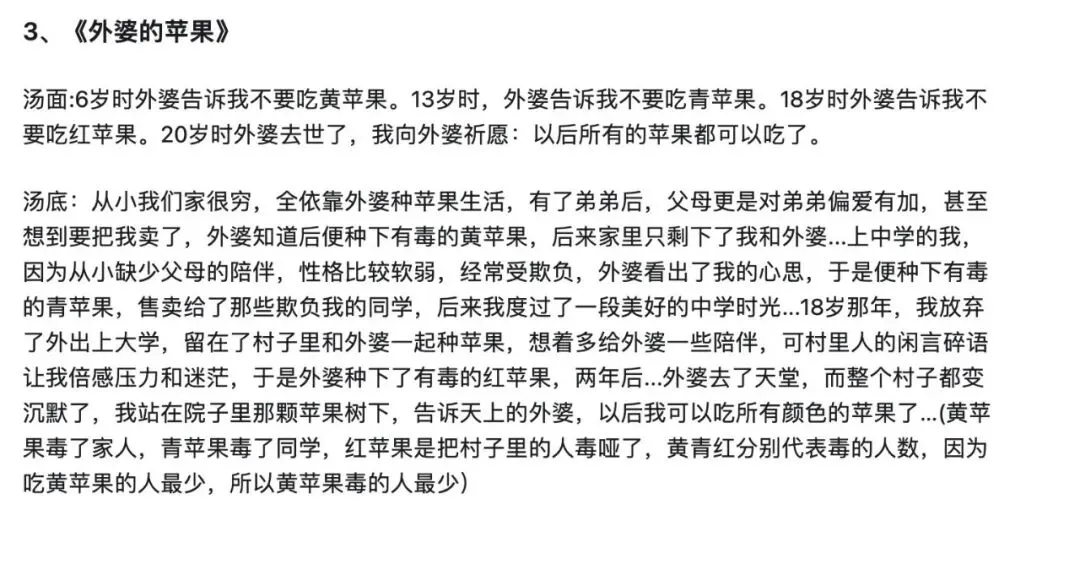 比如给你一个汤面:“6岁时外婆告诉我不要吃黄苹果。13岁时,外婆告诉我不要吃青苹果。18岁时外婆告诉我不要吃红苹果。20岁时外婆去世了,我向外婆祈愿:以后所有的苹果都可以吃了。”