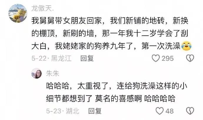 上次刷到一个带女朋友回家,他父母连狗盆都洗得干干净净的,结果狗都不敢吃饭了,不认识自己的小狗盆了。
