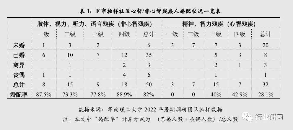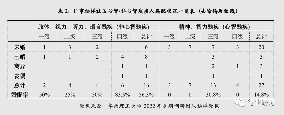 2022年8月,我们在F市进行了一项关于残疾人的短期调研,涉及到了不同致残类型与不同等级程度,年龄上也涵盖老中青三代。调研中我们发现,肢体、视力、听力、语言等致残类型的残疾人大多都有配偶和子女进行照料,而心智残疾人(尤其是男性)基本都在依靠父母、兄弟姐妹等家人在照料。那么应该如何从婚姻家庭的角度去解释这种现象?