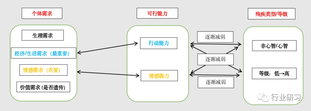 心智残疾人不同于非心智残疾人,非心智残疾人虽然生理功能受损,但其心智仍是健康的,仍可积极地发挥能动作用,尽可能地减少生理障碍对自身造成的不利影响,其不仅可以寻找适合自身的谋生手段,也具备健全人的情感能力,例如上文提到的王叔,在从机械厂下岗之后,依然可以利用右手做木工来养活家人。因此,肢体残疾人有更强的可行能力,也能更好地满足相对应的需求。
