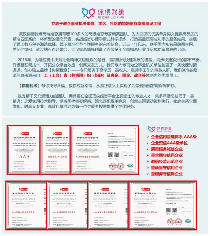 武汉市你情我缘高端婚恋拥有着100多人的高级婚恋专家精英团队,为大武汉的优质单身男女提供高品质的精准匹配系统,将新型的婚恋元素,实战婚恋心理学模式科学提炼,打造高品质高成功率的服务结果。实现了线上数万单身海选优择,线下精准推荐个性服务的完美结合,几十年以来,联手百合网、世纪佳缘网、武汉钻石百合婚恋,武汉蜜恋情缘创造了连续多年全国婚恋行业介绍成功率新记录。