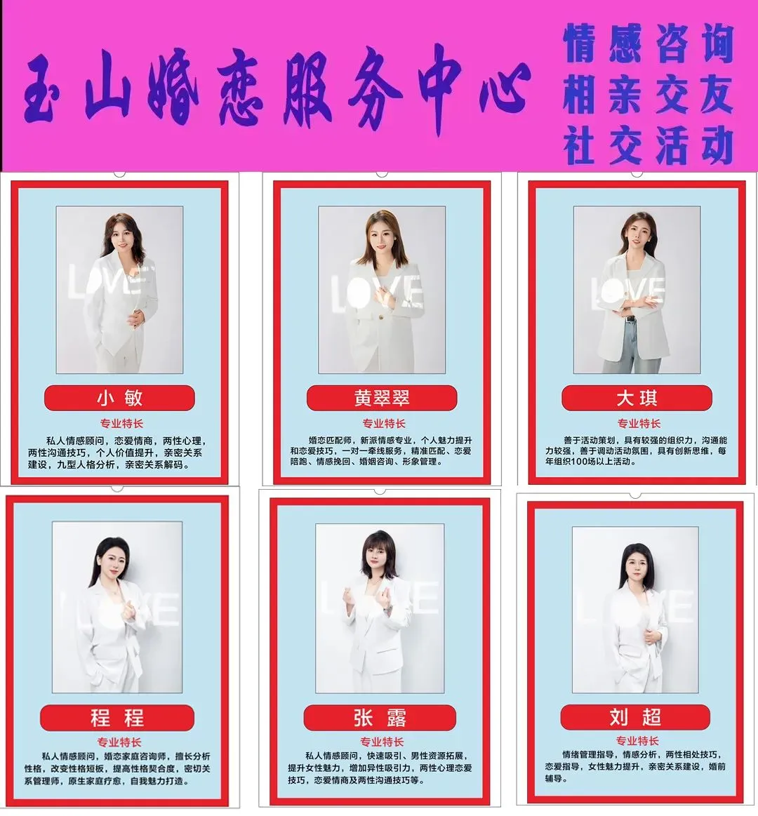 玉山婚恋服务中心,主要是通过线上注册+线下社交+一对一专业红娘牵线的服务模式为主,以解决玉山单身男女的婚姻大事为终身奋斗目标,致力打造玉山本地诚信、真实、靠谱、高效的综合婚恋服务平台!是玉山互联网+婚介模式的先行者,目前平台拥有单身嘉宾人数已达数万人!