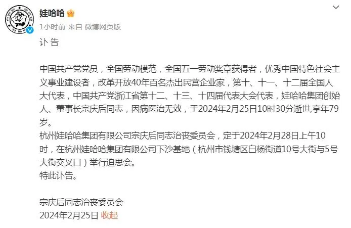 2月25日,哇哈哈集团发布讣告,其创始人于当日10时30分因病逝世,享年79岁。