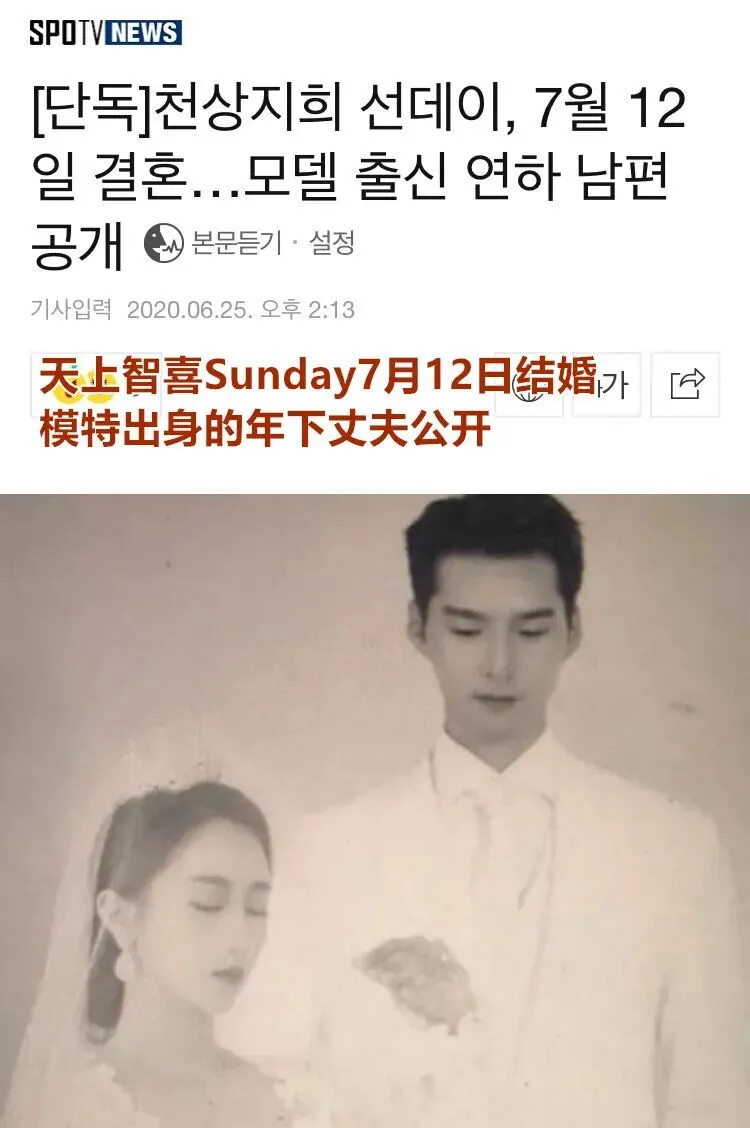 25日据韩媒报道,组合天上智喜的成员智声Sunday将于7月在首尔某酒店举办婚礼,Sunday的准新郎是比她年纪小、模特出身的公司职员。