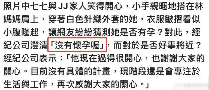 这次林俊杰官宣后,还有粉丝爆料说七七怀孕了,是借子上位,不过公司出面辟谣,说没有怀孕,所以此消息的真假性还需要后续慢慢验证。