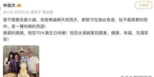 12月29日晚,林俊杰在微博上晒出了一张全家福,照片中除了父母,还有一位温婉可人的年轻女子。他写道:“爱不需要长篇大论,而是无论晴天或雨天,都坚守在彼此身边,给予最真挚的陪伴。”这张照片不仅是庆祝妈妈七十大寿,也正式宣布了他的新恋情。
