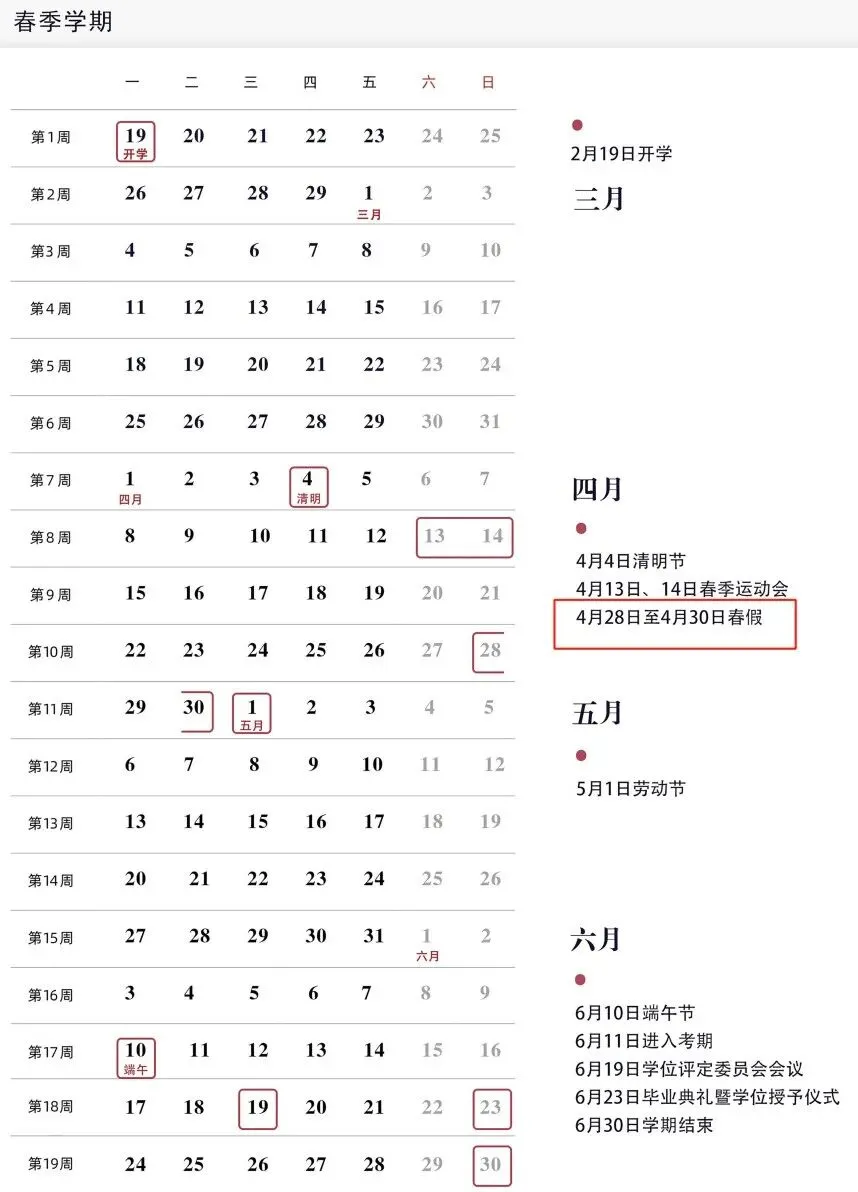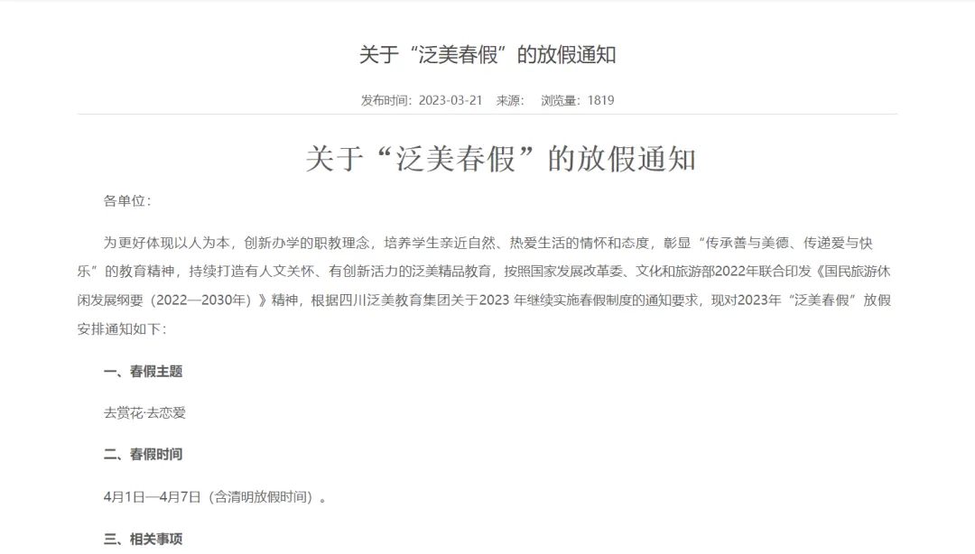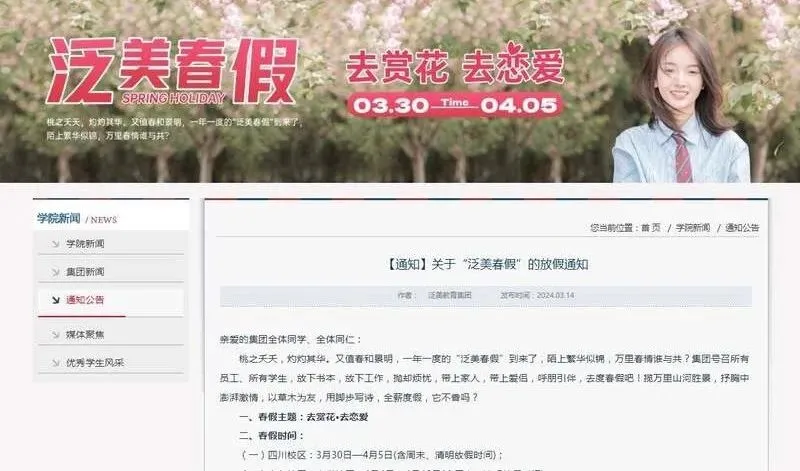 该校官方网站发布泛美教育集团的通知,该集团号召教职工、学生,放下书本,放下工作,带上家人,带上爱侣,呼朋引伴,去度春假。今年的春假主题为“去赏花·去恋爱”,四川校区(四川西南航空职业学院)春假时间为3月30日至4月5日(含周末、清明放假时间)。