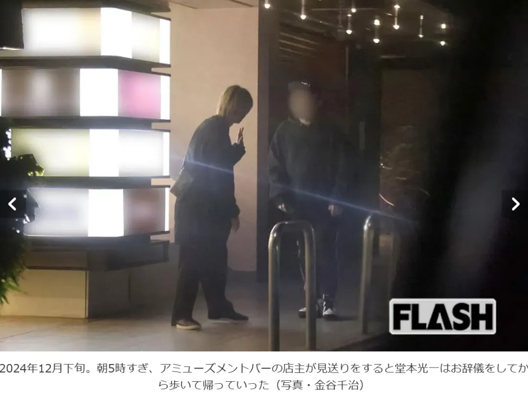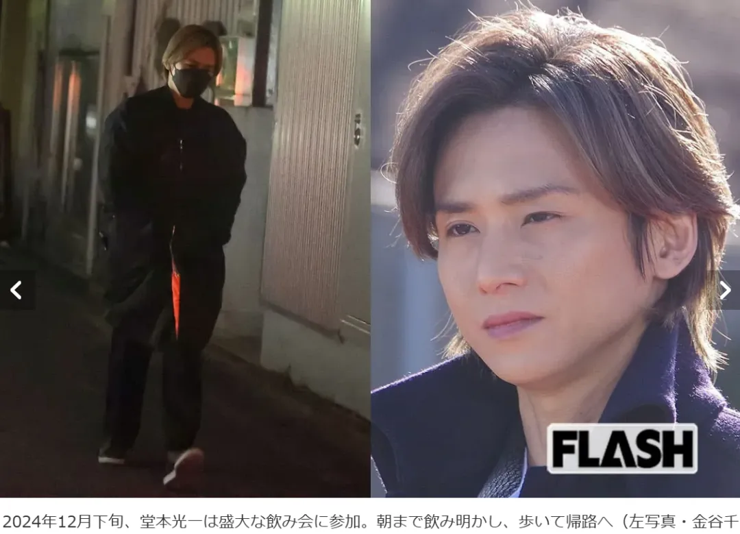 “此番冒昧以私事叨扰,谨向一路以来支持着我的各位相关人士报告,本人堂本光一已经步入婚姻殿堂。”在年末,娱乐圈中关于艺人结婚的消息满天飞,而通过所属事务所宣布“喜结连理”的是DOMOTO的堂本光一。作为偶像,堂本多年来一直活跃在一线,却很少提及自己的私生活。因此,当他宣布结婚的消息传出后,粉丝们纷纷送上了祝福。据报道,堂本的未婚妻是一位前女演员。“堂本的恋情是在2023年被曝光的。当时,他因主演并执导音乐剧《Endless SHOCK》而与这位女演员相识,并开始了长达约10年的交往,这一消息是由体育报报道。2025年9月,该女子删除了自己的Instagram账号,并离开了所属事务所,这使得外界开始猜测他们即将结婚。”(娱乐记者)如果这一系列报道属实,那么堂本光一经过12年的真诚交往,终于决定结婚。在社交媒体上,大多数评论都表示了祝福和支持。“希望与他共同走过漫长岁月的她,能够迎来一个温暖且美好的未来……”“令人惊叹的是,堂本光一这样一位国民级偶像,能够对一位女性保持超过10年的爱意,并最终承担起责任,这是非常难得的。”尽管两人有着长久的感情基础,但本刊曾在大约一年前报道过堂本光一与港区女子的“狂欢派对”场景。当时,堂本光一与几位后辈一同出现在东京六本木的一家会员制娱乐酒吧。“当天,堂本光一与前KAT-TUN成员上田龙也一同参加了《Endless SHOCK》的‘庆功宴’。他们经常选择这家酒吧来举办大型聚会,因此与酒吧老板也很熟悉。据说,那天因为邀请了太多女性,聚会变得像一场大型联谊活动。”(堂本光一的朋友)除了上田龙也和堂本光一外,还有大约四名帅气的男性进入酒吧,随后,约八名打扮得像“港区女子”一样华丽的女性也陆续进入。“据称,真正的狂欢是从晚上10点左右,所有女性到齐后开始的。堂本光一似乎玩得很开心,一直喝到第二天早上5点。最近,他喝酒的次数越来越多,而且每次都喝得酩酊大醉。这次聚会他可能真的放开了许多。听说这次聚会的账单全部由堂本光一买单。”(同上)独自步行回家的堂本光一,不知道他的爱人是否会在家中等着他,给他一个温暖的拥抱……
