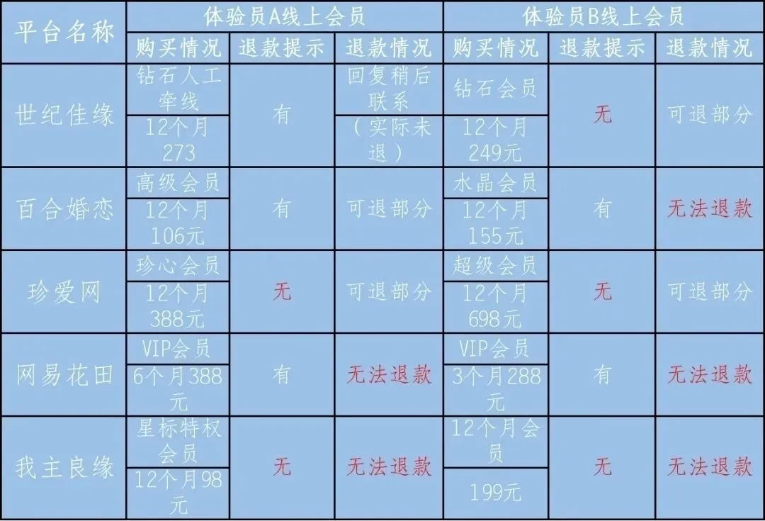 本次调研中,部分网站对充值会员退费规则未完全明确,实体门店的所有会员协议中也都未明确规定解约条件及双方应当承担的违约金比例,消费者在购买时无法得知所签订合同的具体解约情况,会员协议存在披露不完善情况,侵犯消费者知情权。另外世纪佳缘网站钻石人工牵线会员明确提示可以退款,世纪佳缘B店会员协议明确表示消费者可以协商解约,但最终实际退款时均推脱不履行责任,其退费规则由经营者自行解释操作,侵犯了消费者公平交易权。