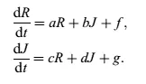 我们得到一个二维的动力学模型,由相应的初始条件和四个系统参数a,b,c和d以及两个输入项f和g进行控制。假设所有参数在这两个方程中是不变的。