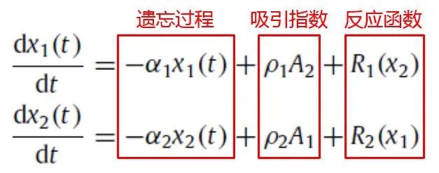方程主要由遗忘过程、吸引指数(appeal)、反应函数(reaction)三项组成: