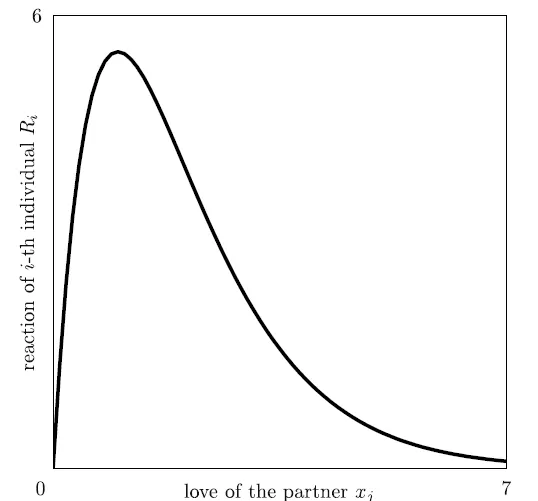 而反应函数则与情侣双方的性格有关,比如健康型人格(secure individuals),也就是阳光型,正面型的人格,这种人格形成的反应函数可认为是线性函数或有界函数,而安全防御型人格(insecure individuals),的反应函数则会是一个有阈值的曲线。这种刺猬型防御型的人格有一个典型的特点是,初期他的感情增长与对方的感情投入成正比,但是当情感增长到一定高度,如果对方继续投入感情,则反而会使得他的情感感受迅速降低。也就是阈值之前相应增长,超过阈值快速降落。