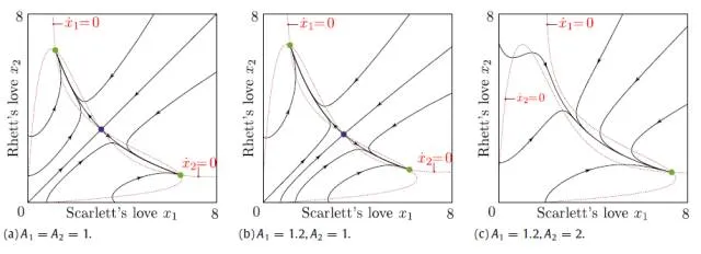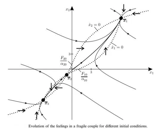 而在不同初始条件下Fragile Couple的情感变化则要复杂许多,在两个平衡点之间存在一个不稳定的鞍点,这类情侣关系相对脆弱,很有可能“因爱生恨”。