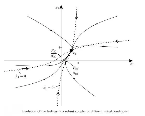 这三个限制导致本系统只趋向于平衡点(equilibrium point),即两人关系趋于稳定,也就是稳定的好或者稳定的差。所谓平衡点就是系统状态方程中,各状态变量导数均为0的点,在非线性系统中可以出现多个平衡点。