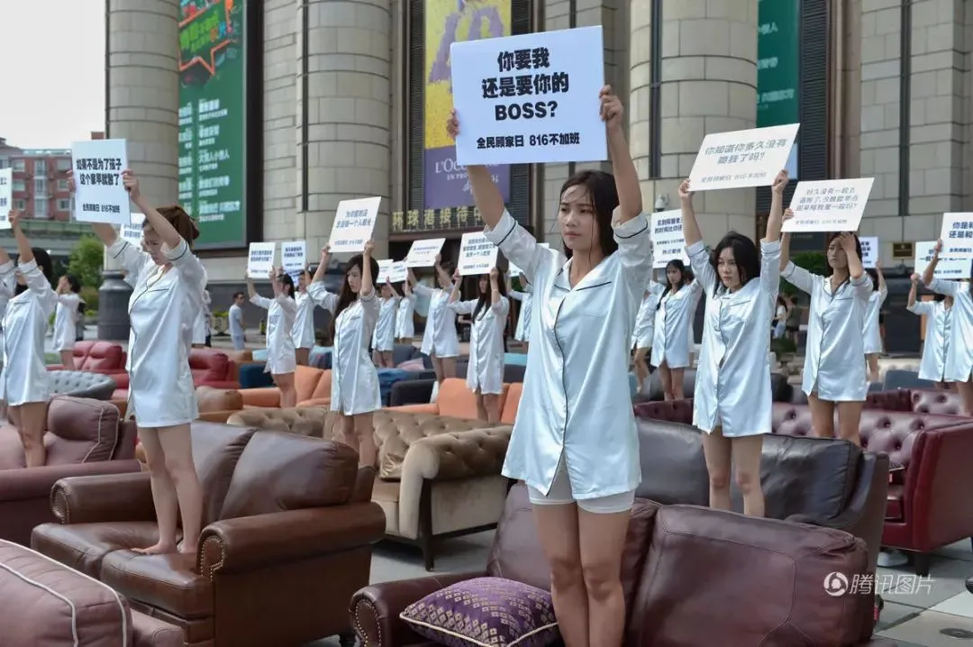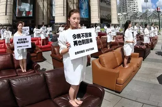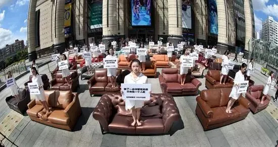 穿着睡衣的女子,站在双人沙发上,手举标语,向世界发声。