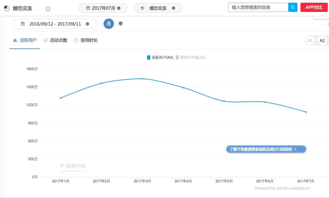 从2017年1月至7月的数据来看,婚恋交友APP的活跃用户规模,始终没有超过1800万人。