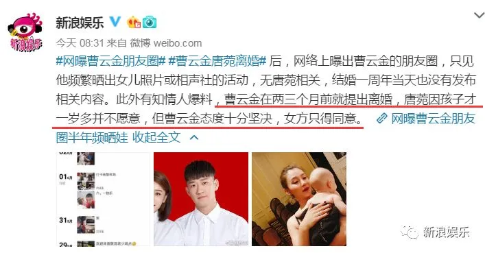 曹云金和前妻唐菀去年6月离婚,因为两人闪婚又闪离,而期间曹云金曾在唐菀哺乳期的时候,被拍到和陌生女孩一起。