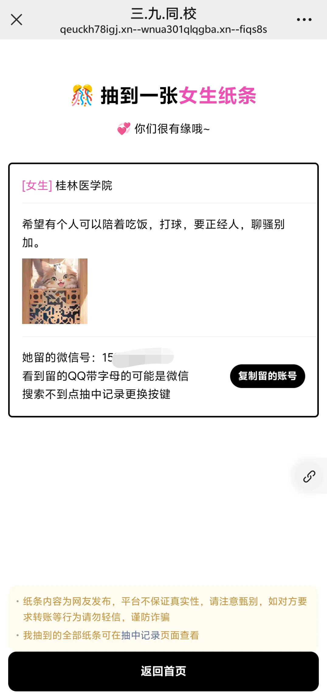 查看自己所抽取到的纸条信息,如有中意,直接加联系方式,向甜甜的恋爱迈开第一步!!!🥰🥰🥰