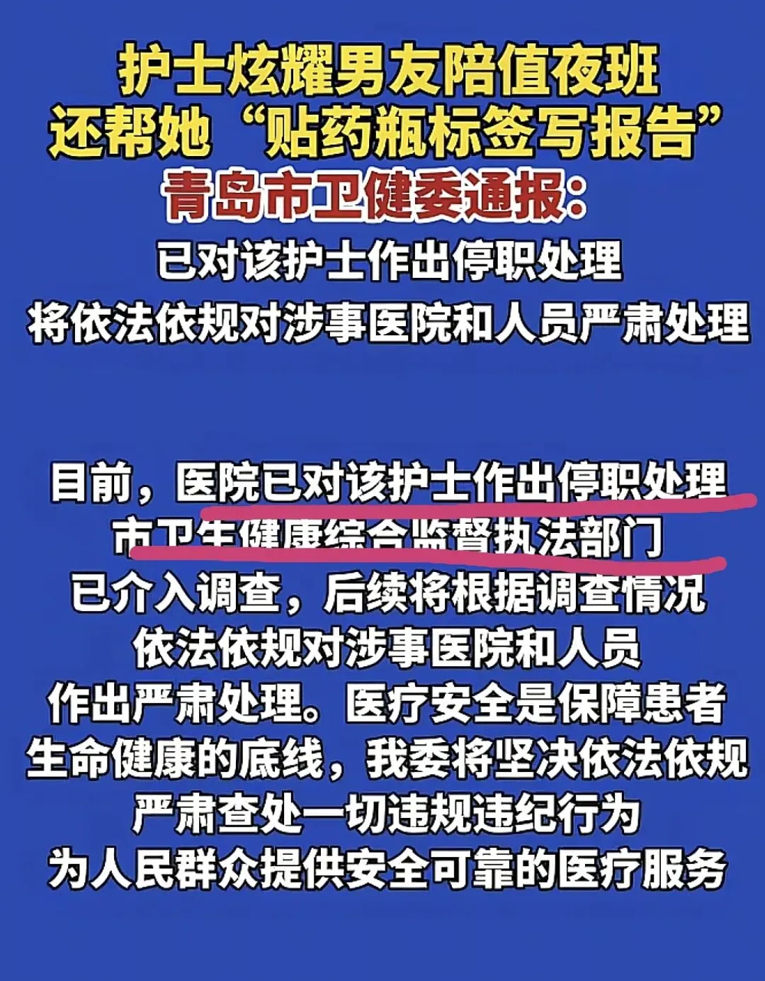 目前市卫生健康综合监督执法部门已介入调查,后续针对调查结果,将依法依规对涉事医院和人员严肃处理。