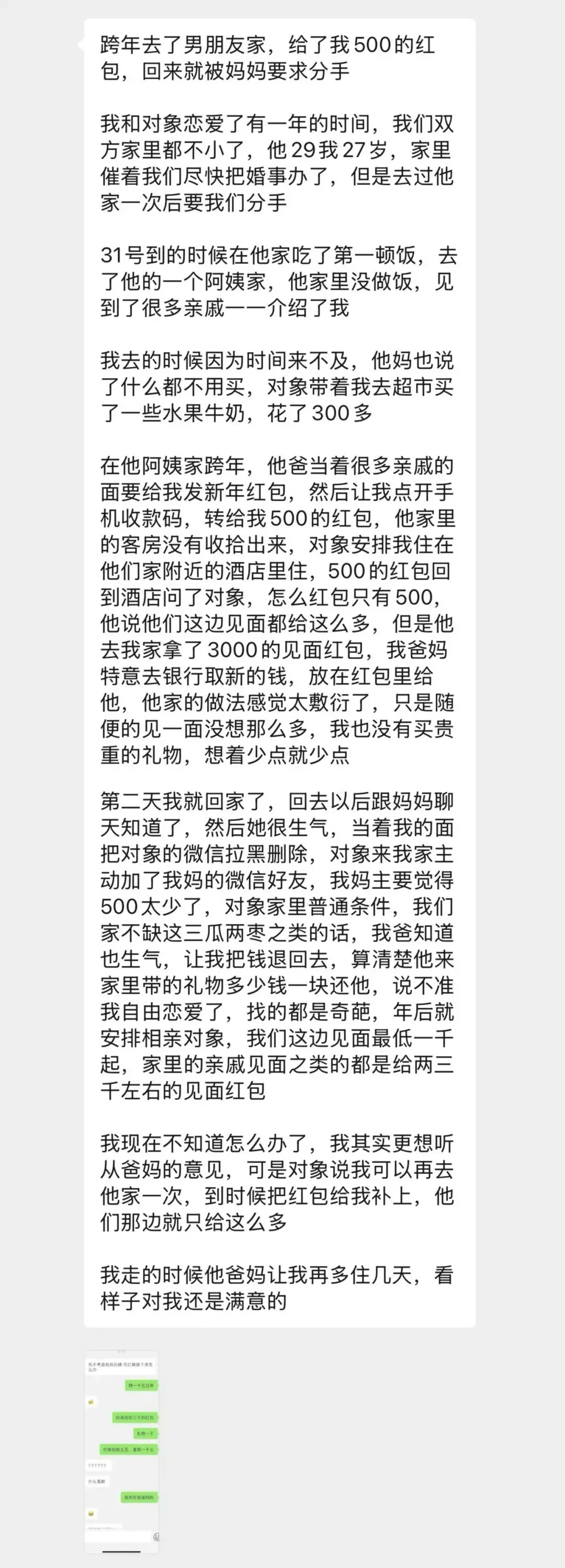 >跨年去了男朋友家,给了我500的红包,回来就被妈妈要求分手!
