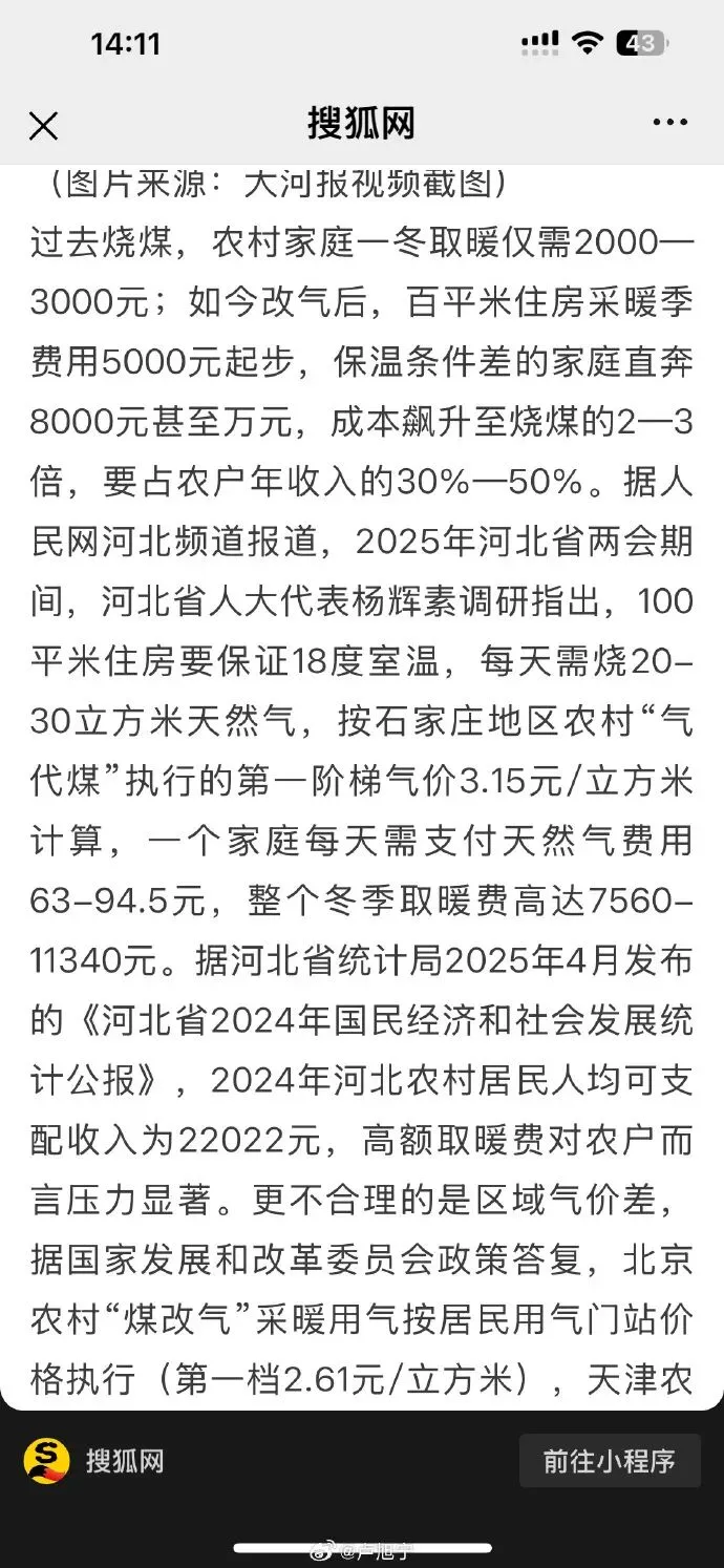 气价高30%、成本翻2倍、补贴砍80%,这组数字的背后,是政策执行中成本分担的失衡,更是老病因未除、民生痛点反复的现实。蓝天保卫战的成果,从来不该是农民裹着棉袄硬扛出来的。