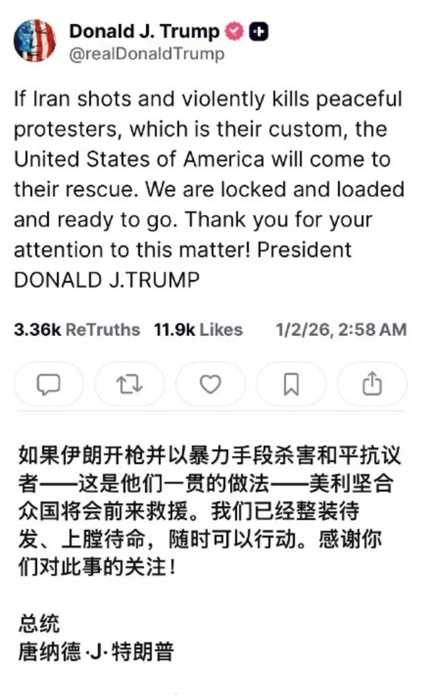 【10】伊朗从货币崩盘与恶性通胀引发的全国性抗议,已从经济诉求转向政权更替,2025年12月官方通胀率达42.2%,食品价格同比暴涨72.3%。普通家庭月收入(约250-300美元)已无法覆盖基本生存成本(400-600美元),底层民众陷入绝境。美国总统川普1月2日发文称将支援抗议者,伊朗政府说美国的介入是外国势力干涉伊朗内政的最新例证,并警告美国立即停止,否则将威胁地区稳定。