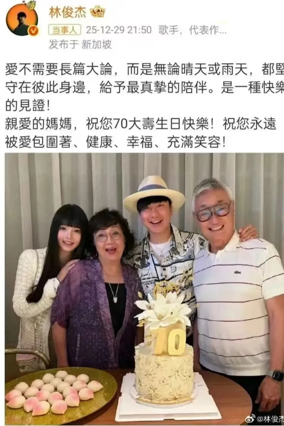 林俊杰在微博发布母亲70大寿的庆生照片中,他站在父母中间,笑容满面,喜悦之情溢于言表。