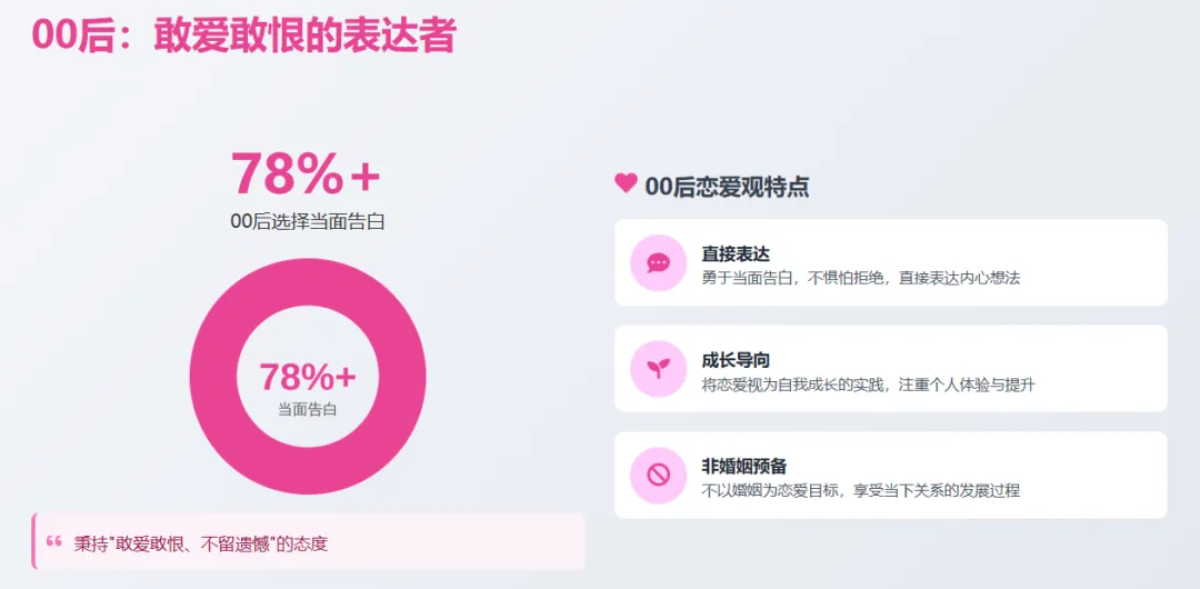 超78%的00后选择当面告白,秉持“敢爱敢恨、不留遗憾”的态度,将恋爱视为自我成长的实践,而非结果导向的婚姻预备。