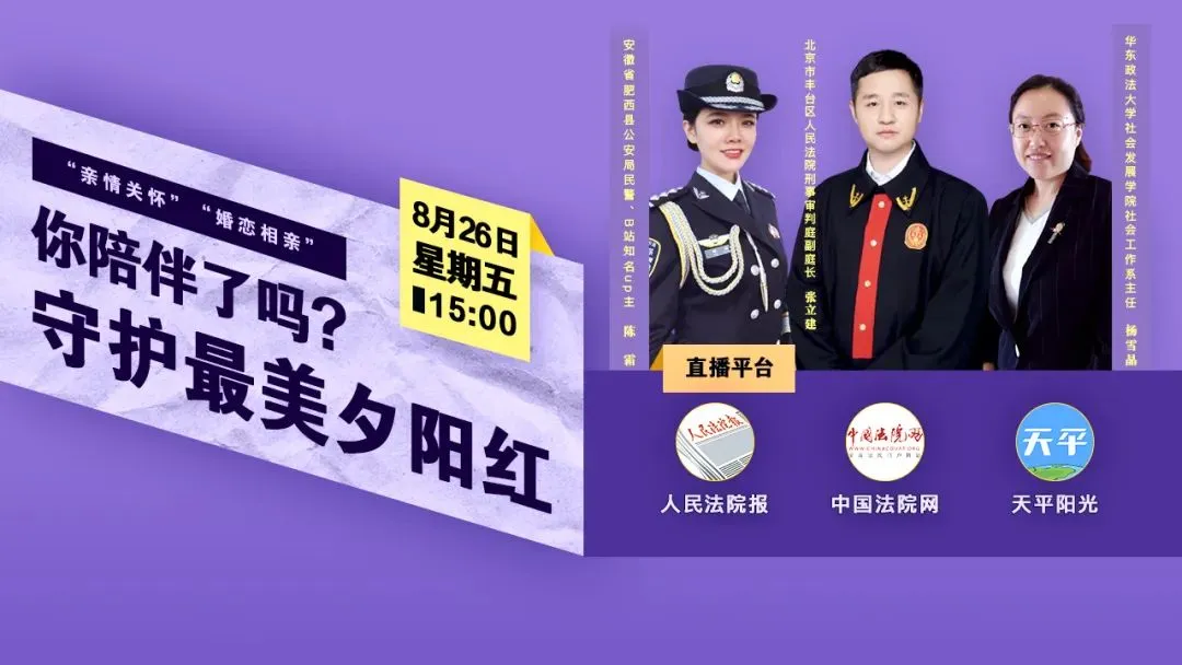 直播中,请到北京市丰台区人民法院刑事审判庭副庭长张立建法官,安徽省肥西县公安局民警、B站知名up主“小霜警官”陈霜,华东政法大学社会发展学院社会工作系主任杨雪晶,聚焦针对老年人“婚恋交友诈骗”,回顾相关案件经过,揭示老年人婚恋交友诈骗案件的典型套路,交流老年人的“情感陪伴”问题。