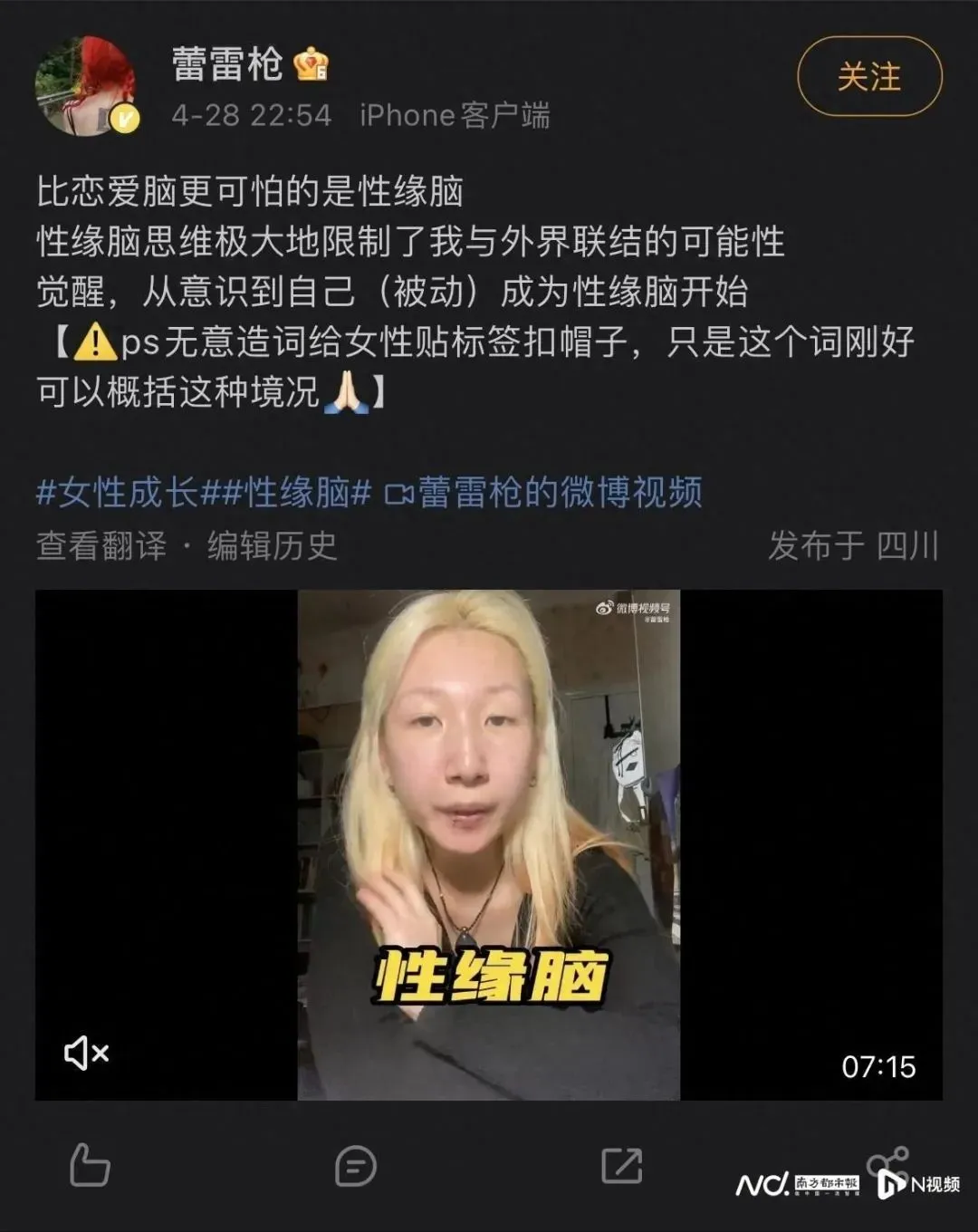 事实上,这并不是“性缘脑”第一次出现在公众视野中。 今年4月,微博博主@蕾雷枪发布了一段题为“比爱情思维更可怕的是性思维”的视频,引发社交媒体上的各种讨论。 近几个月来,《珍惜没有‘性缘脑’的朋友》、《比爱情思维更有害的是性思维》等文章也探讨了性思维这一心理话题。 。 此外,社交平台上的许多用户已经开始分享他们摆脱以性为中心的心态的经历。