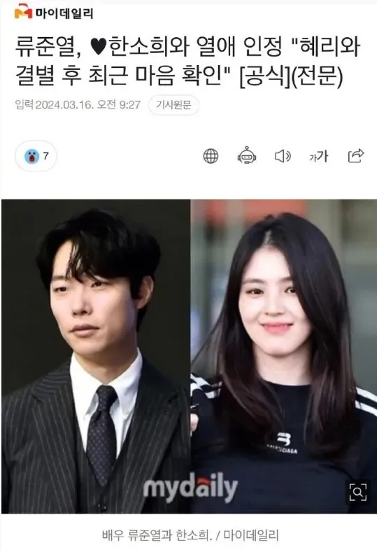 随后,柳俊烈经纪公司也承认恋情,表示柳俊烈在和李惠利分手后认识了韩素希,最近确认了对她的心意,昨天没有承认恋情引起了不必要的误会和臆测,演员的人格权受到了严重侵害。