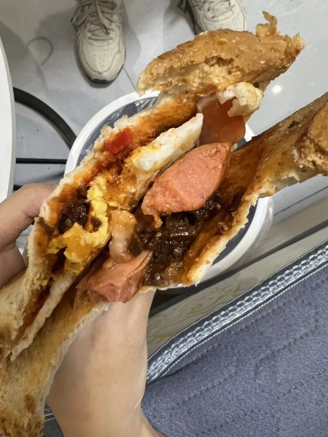 我大声称赞他做的三明治是最好看的 是最好吃的 戏子 儿童心理学 真的挺好吃哒 吃的饱饱的 鸡蛋还有点溏心超级好吃 还抹了我爱的仲景香菇酱 嘻嘻😜