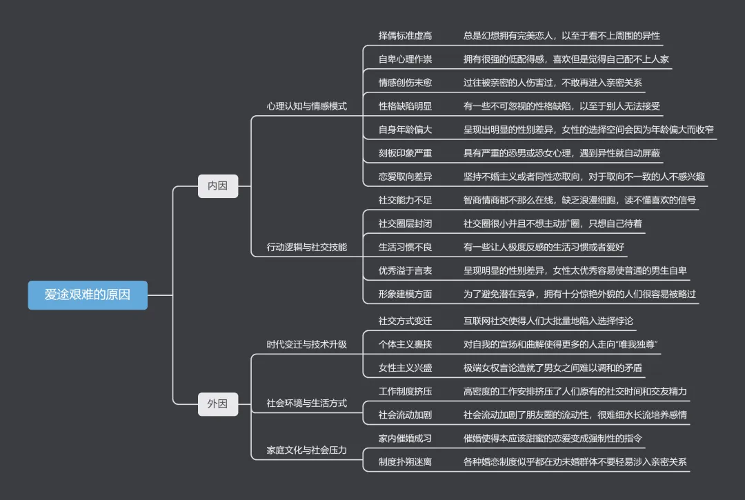 诚然,内因是一切改变的根源,外因则是变化所不可或缺的条件。恋爱看似是一个人的事,实则是一个宏大的议题,它关乎时代变迁与技术升级、社会环境与生活方式、家庭文化与社会压力。