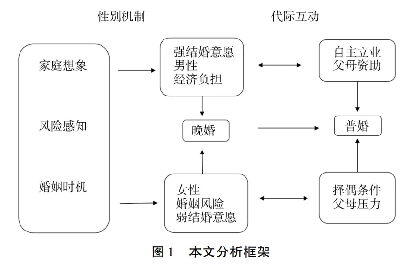 在传统性别角色规范持续发挥影响、代际关系依旧密切互动的双重背景下,个体在婚姻决策中虽拥有一定自主,却始终难以实现“完全自主”。为探讨这种“有限自主性”如何形塑农村籍高学历青年“晚婚却仍普遍结婚”的行为逻辑,本文聚焦于下文所称的三大“婚恋观”维度———即“未来家庭的想象”“婚姻风险感知”和“婚姻时机选择”。之所以选取这三方面,一方面是因为它们分别代表了青年对婚姻美好图景的期待、对婚姻破裂或财产纠纷的风险评估,以及对何时进入婚姻的具体行动选择;另一方面,它们在性别差异与代际互动的交织下,最能凸显当代青年自主意识与传统制度束缚之间的张力。本文具体的分析框架如图1所示。
