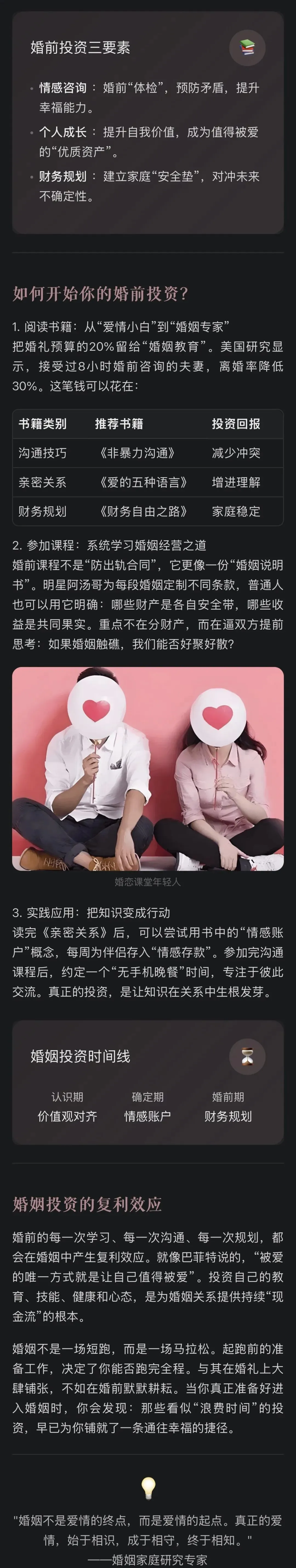 2、恋爱实用指南课程: 学习恋爱指南,包括:婚恋五部曲、认识男女差异、学会爱的表达、处理过往的感情垃圾、金钱管理、冲突处理等。