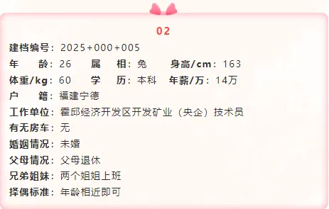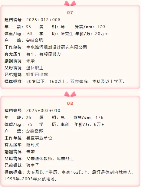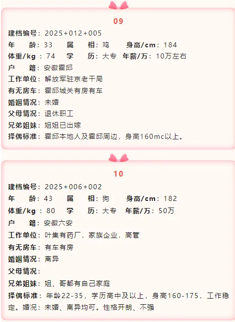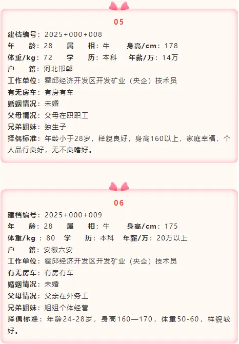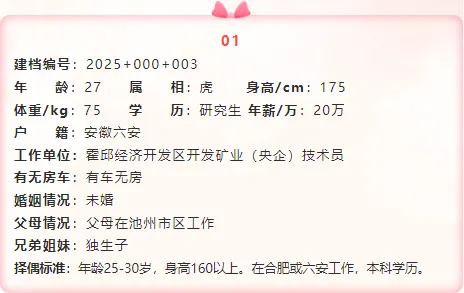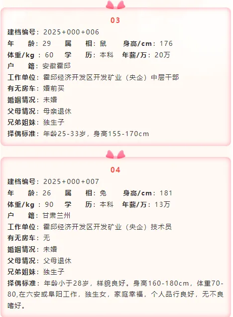 如果您对上述发布的男嘉宾想进行深度了解,在霍邱妇联公众号后台留言回复对应的嘉宾建档编号(例如:男+建档编号“2025+001+006”),工作人员会第一时间将负责此嘉宾建档信息的公益红娘电话私发给您,方便您们进一步沟通了解。