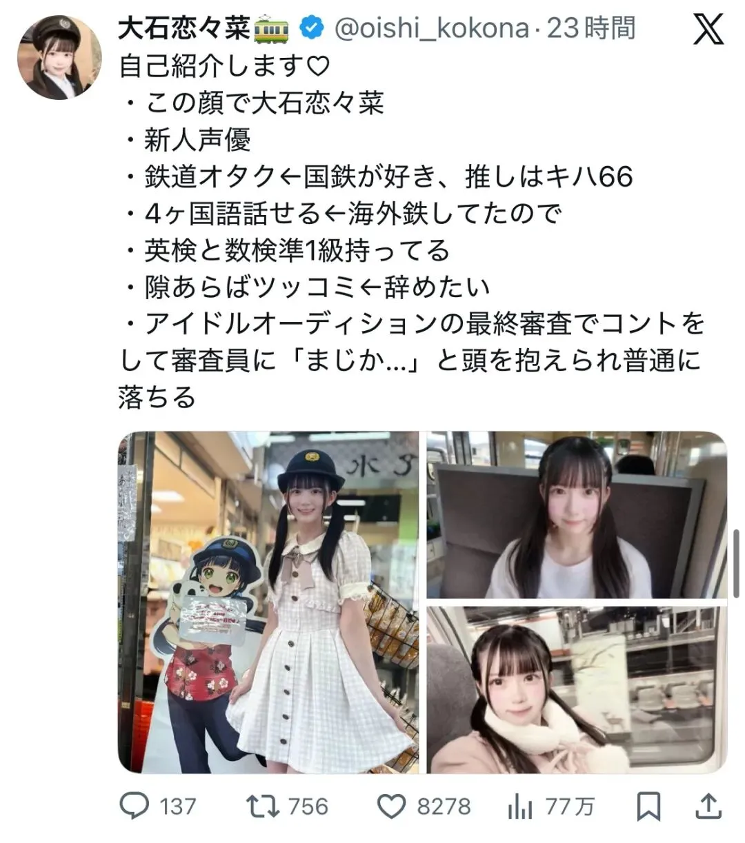 1月2日,日本新人声优大石恋恋菜发的一条帖子成功引起了日本宅男的大量关注。