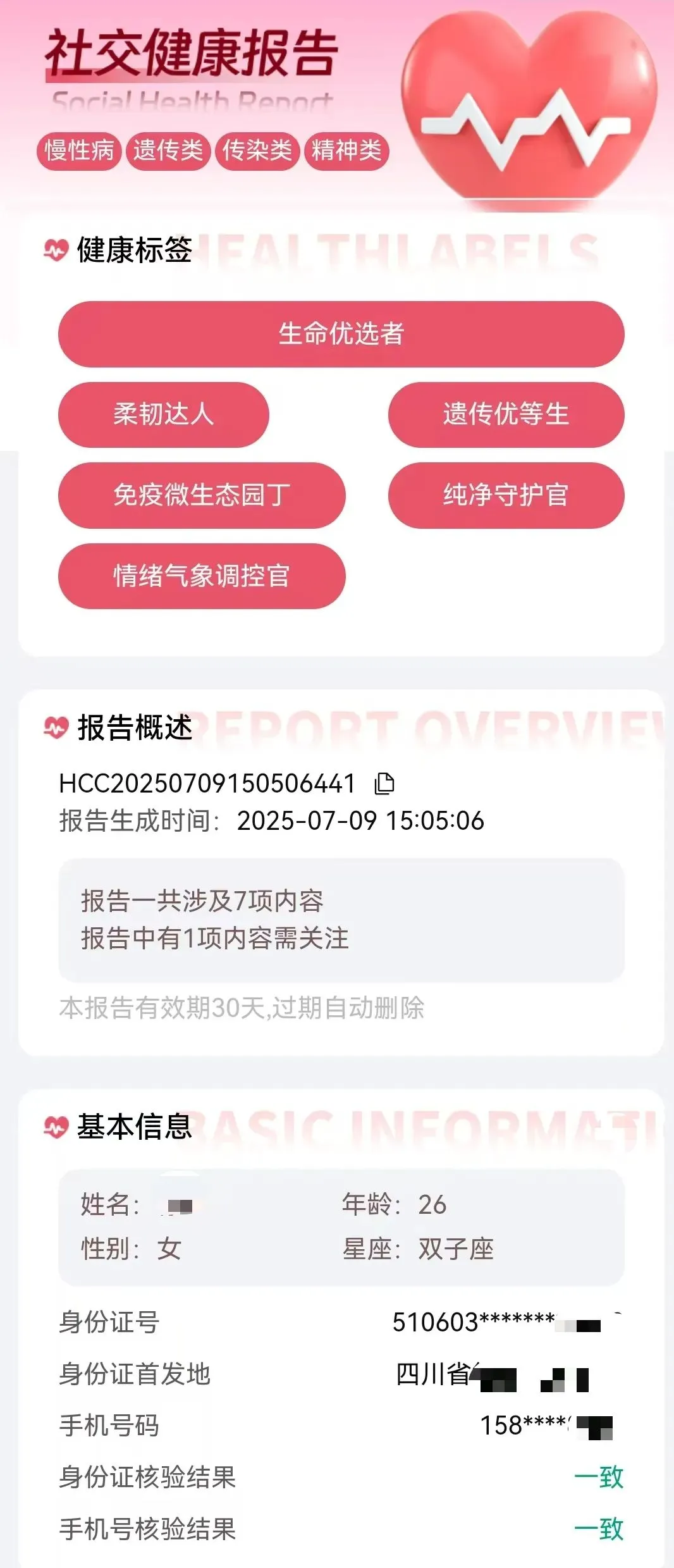 滑动查看权威健康报告示例,报告并非一般普通体检,远超常规体检范围,包含了遗传疾病、传染病、性病、精神疾病、慢性病等方方面面的检查,为你的幸福把好第一道关卡。滑动查看社交诚信报告示例。社交诚信报告全面核查对方婚姻状况、信用记录及法律风险,包括不良负债、金融异常、失信行为及民事刑事案件等,有助规避婚前债务风险,为婚恋关系保驾护航。✔ 面谈保真:执行"三真"原则(真人、真信息、真意愿)。推荐嘉宾全部经过红娘面谈,审核真人,以此来杜绝网络照骗和网络相亲资料的不对称,去伪存真。✔ 精准筛选:红娘深度了解你的需求,根据需求来筛选、推荐、牵线意向嘉宾,避免盲目试错,告别低效社交,直接对接优质人选。✔ 全程陪伴:从相识到相恋,每一步都有专业指导,从需求梳理,形象打造、沟通技巧,到约会策划、关系推进,均提供全程陪伴式指导,爱情不该靠运气,而要靠对的策略。