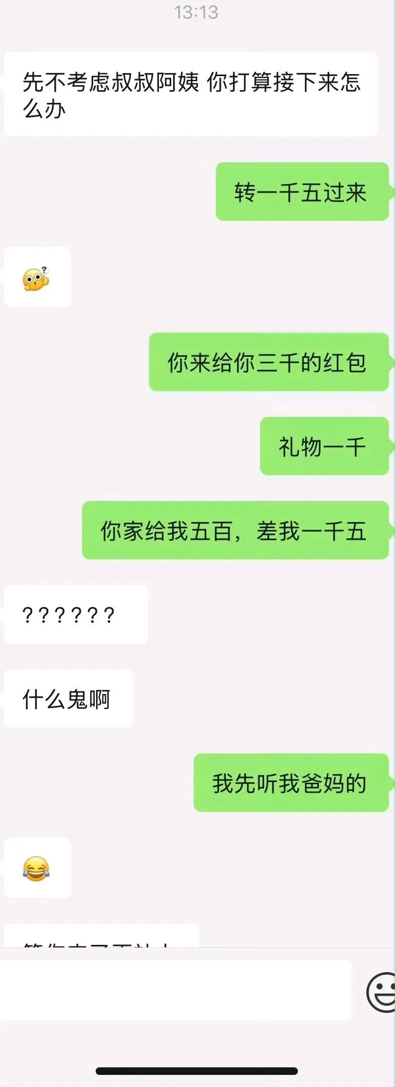 不好撩别撩我: 收人家3000,他父母给五百,他咋好意思说你父母不懂事的