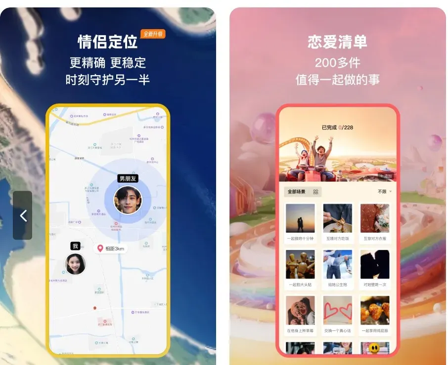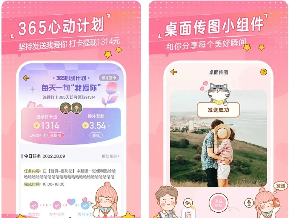 关键词:实时定位、经期记录、同步任务恋爱记是国内早期情侣社交软件,主打“每日打卡挑战”与“情侣共同账户”。情侣能设早晚打卡及纪念日提醒,“共同存钱”可设旅行基金等目标,不过提现规则复杂,有额度限制。 特色功能: