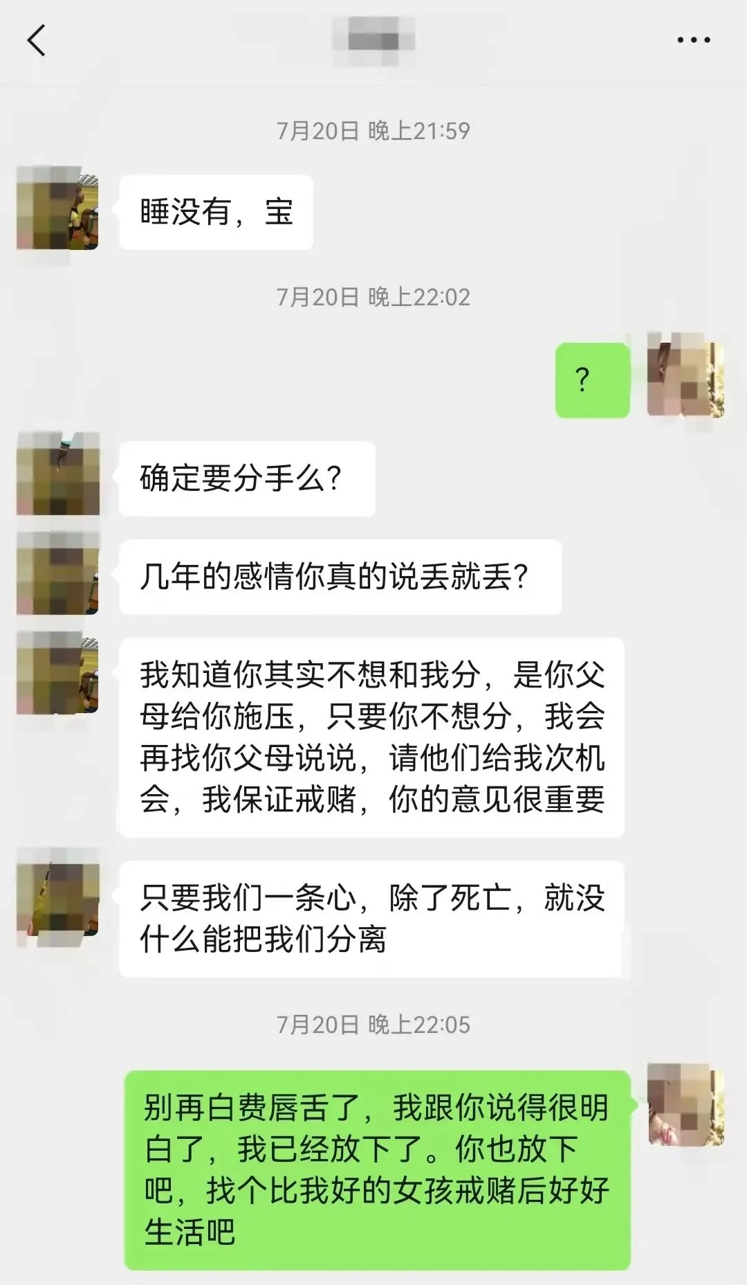 分手后,前男友多次求复合,说他父母愿拿出10多万帮他还债,剩下的他自己还,不让我承担,几年就能还清。他妈为了帮他还债,去餐馆当洗碗工了。他求我给他改错机会,保证戒赌。我把他的话告诉父母,他们还是不同意,还开始给我介绍对象。迫于父母压力,我只能放弃这段感情。