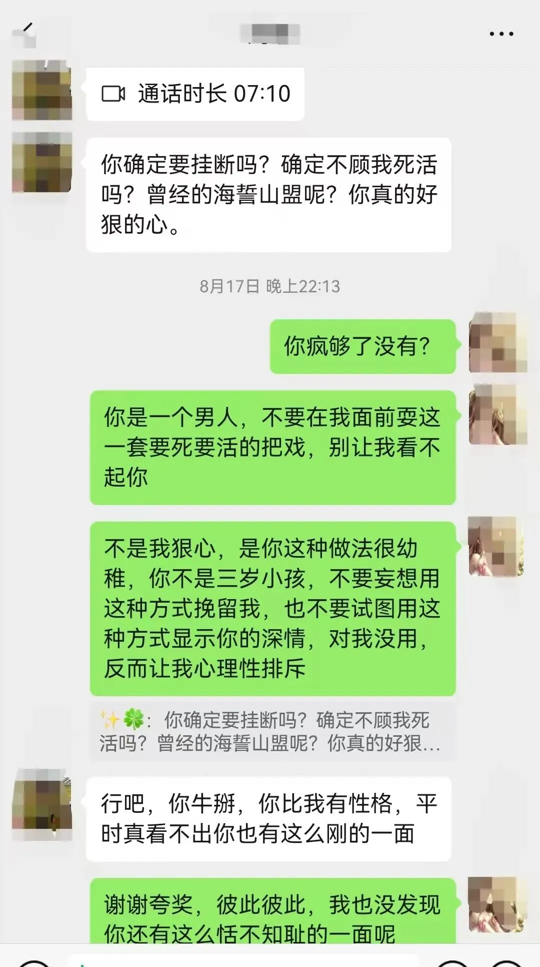 可他没放下,听说我要相亲,就跟我视频,拿着水果刀对着手腕要挟我复合,说不同意就割腕。说实话,我没觉得这是爱我,只觉得他很陌生,让我看到他阴暗的一面。我觉得他是赌博赌昏头了,这样的人我哪敢和他结婚,他对自己都这么狠,婚后说不定会家暴。他以死相逼,让我觉得他思想和人品有问题。我很庆幸通过这事看清他。要是婚后他才暴露真面目,我就进退两难了,现在我至少自由,没婚姻束缚。看他情绪激动,我劝了几句,见他没放下刀也没割,就挂了视频拉黑他。这种动不动寻死觅活的男人,真让我恶心。