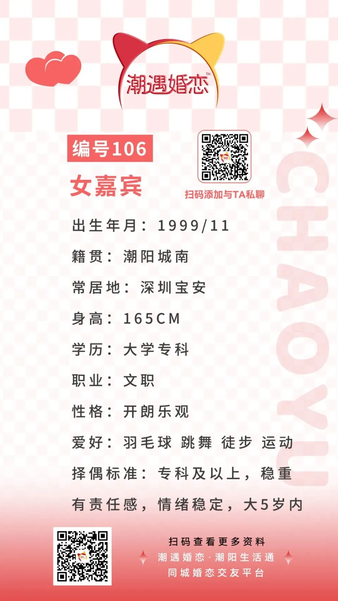 【潮遇婚恋】嘉宾:编号106号女嘉宾 · 身高165,长相清秀~