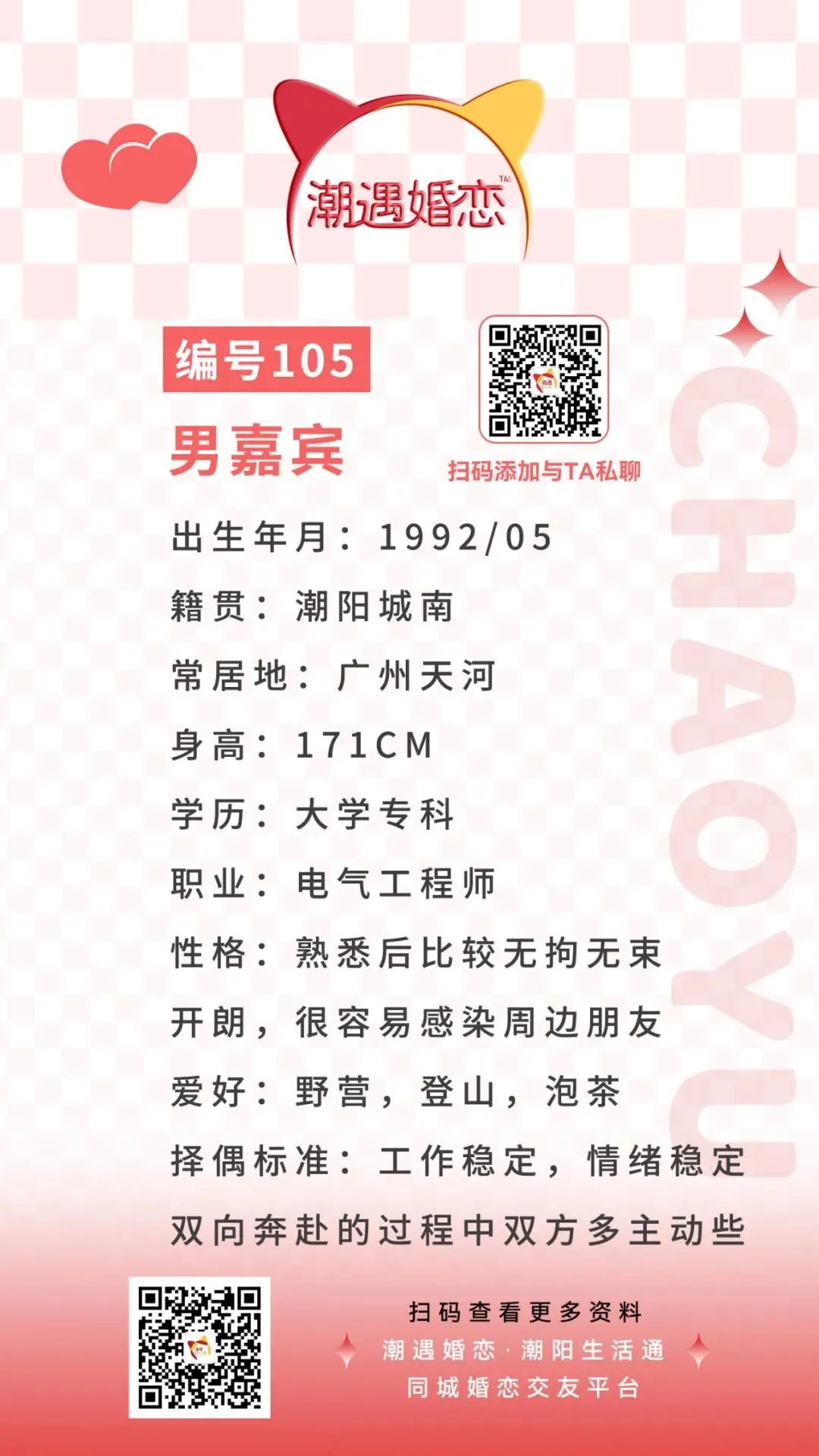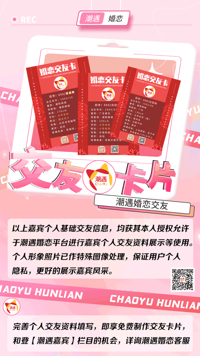 诚意想与嘉宾认识的可扫码联系潮遇红娘牵线,将本期嘉宾的编号/交友卡片发送给潮遇红娘,开启心动模式,与嘉宾微信聊天深入了解哟!