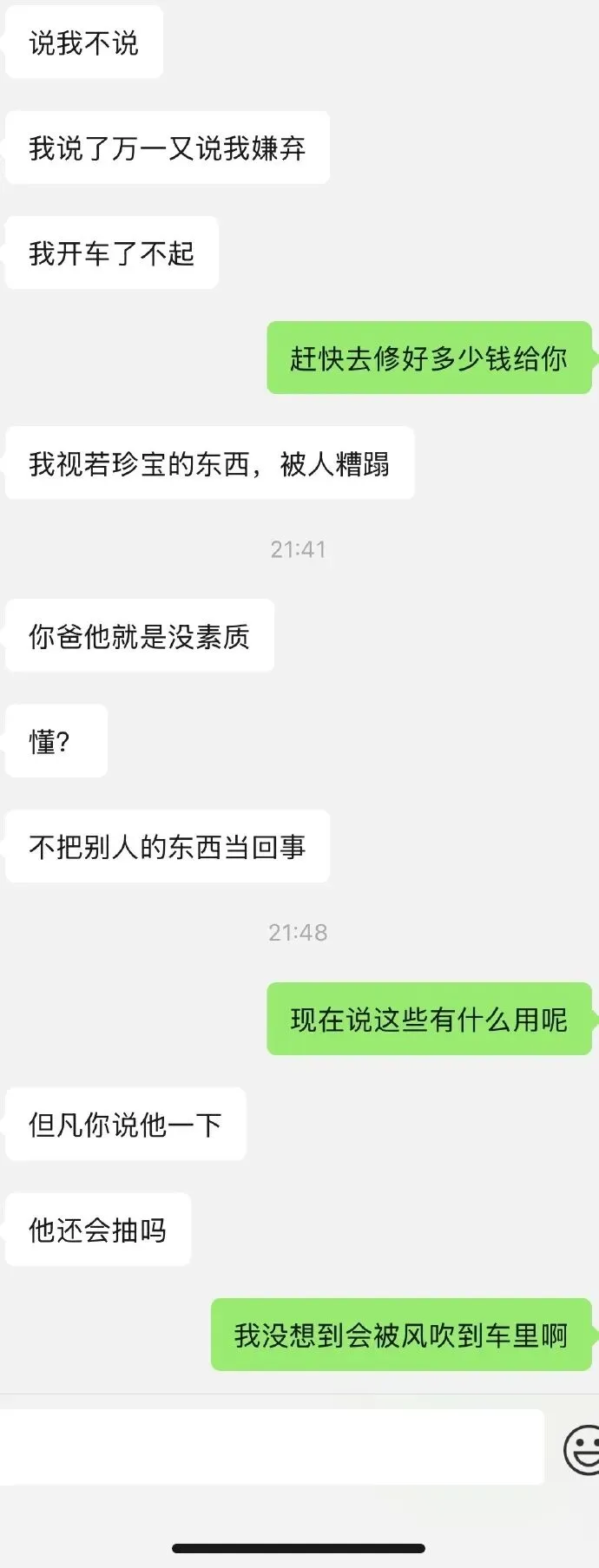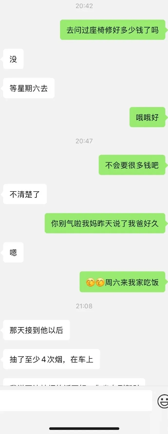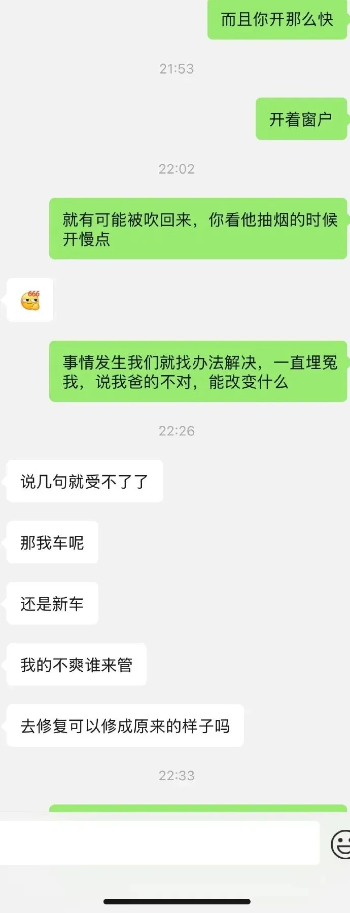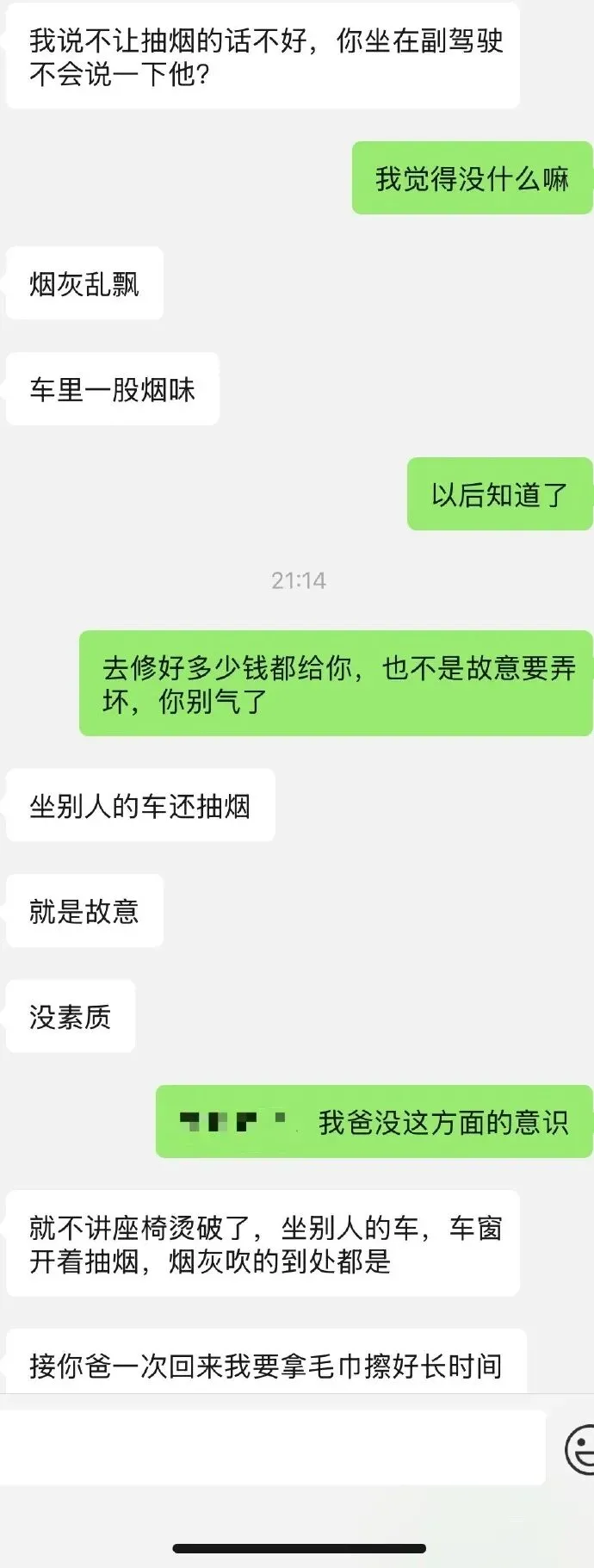 我们恋爱2年了,他见过我的爸妈,这次我爸爸从外地坐高铁回来,到高铁站我俩开车去接,高铁站离我家开车要半小时,我爸到的时候已经晚上八点了,打车回去比较贵又不方便,接到我爸以后先去吃了饭,又开车把他送回家,上车的时候他点了一根烟抽,男朋友不抽烟,抽的时候开着窗户,男朋友速度开的比较快,我爸丢烟头的时候又吹了回来,后面问到一股味道才看到烟头,我爸连忙对我男朋友道歉,说把他刚买的新车就弄坏了,我男朋友嘴上说着没事,脸上已经有着生气的表情了,我就说去找个汽车美容店问,要修多少钱到时候给他,他也没再说什么。