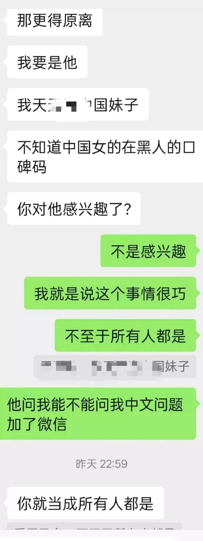 我昨天和男友,或者是前男友吧,我还没下定决心分手,说我晚饭时候帮一个黑人点餐,然后和黑人聊天,关于学校和学习汉语的问题,后来加了V。