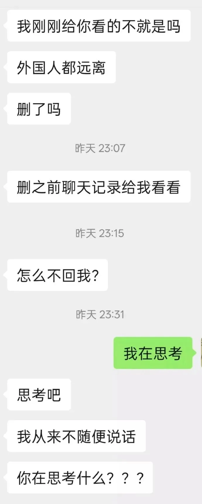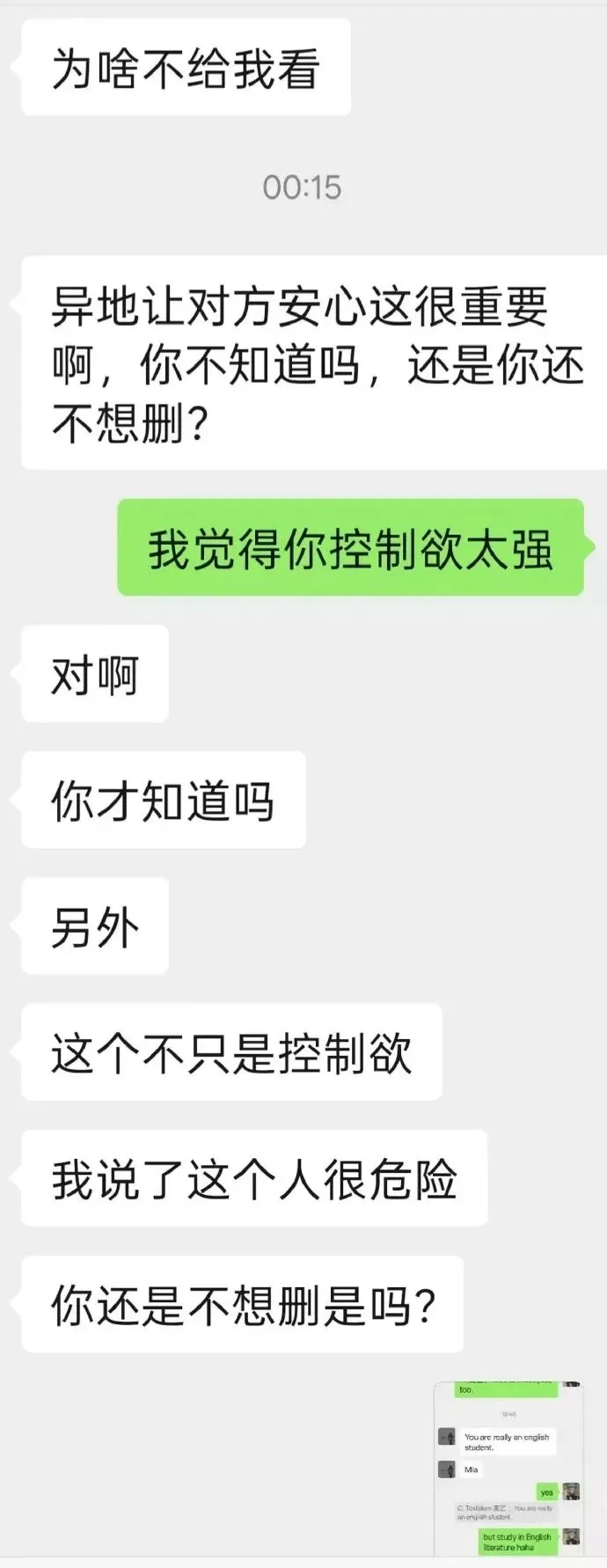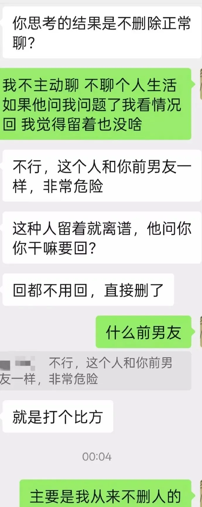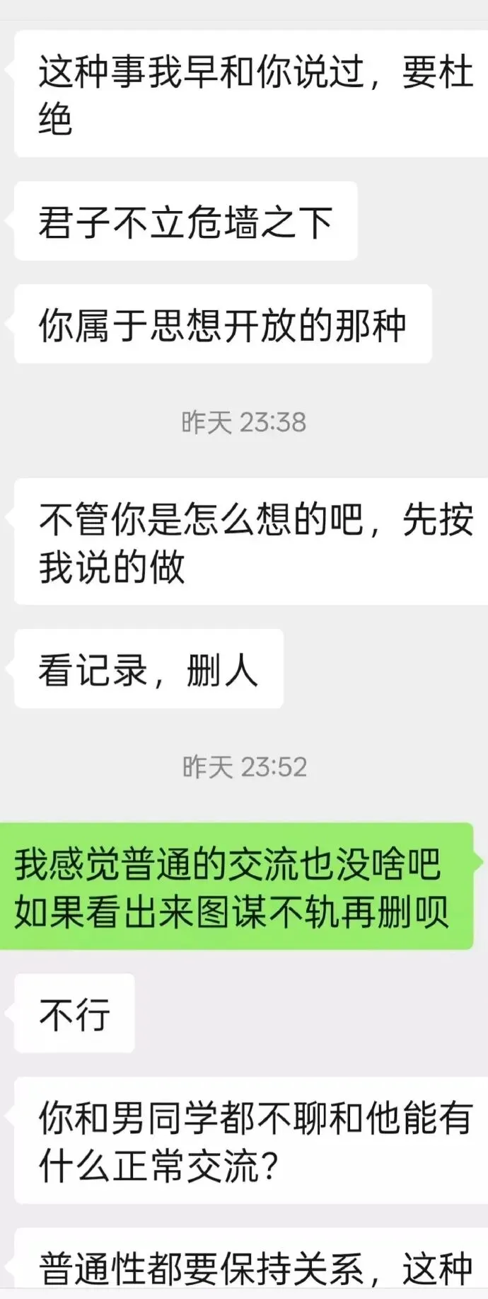 其实他之前就有要求我删除异性联系方式的举动,包括中学时期的前男友、在高铁上有所交流的男生、在群聊里加的男生。