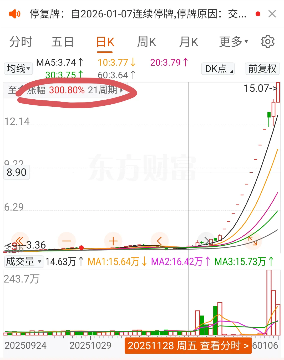 从11月底12月初开始上涨,累计涨幅达300%,今日起因为交易异常停牌。