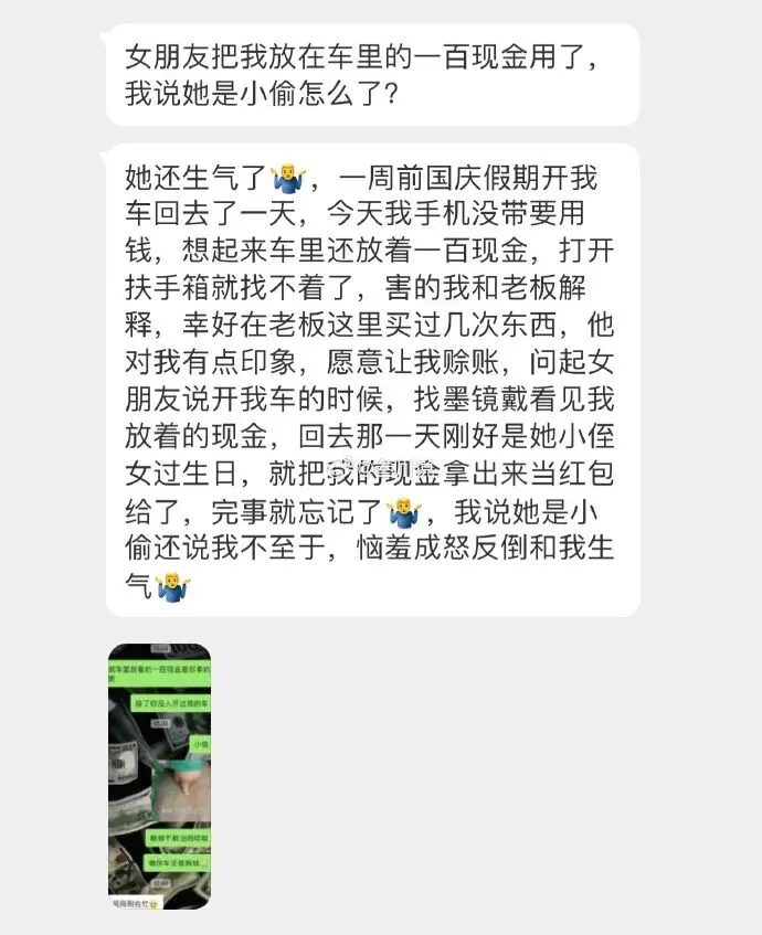 女朋友把我放在车里的一百现金用了,我说她是小偷怎么了???