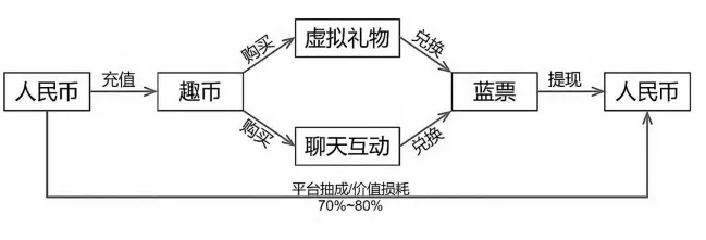 Q 平台通过投流广告向女性用户传递 “零门槛兼职” 的情感劳动认知,将情感陪聊与经济收益直接挂钩。平台以 “虚拟货币+虚拟礼物” 为核心载体,构建了全链条情感货币化生态,成为线上 “情感加工厂”。其虚拟货币体系包含趣币与蓝票,兑换逻辑为 “人民币→趣币→蓝票→人民币”,用户充值1元可获70趣币,收到10趣币礼物可兑换1.5蓝票,进而提现0.03元,蓝票是唯一可提现的虚拟货币,女性用户主要通过聊天互动和获取虚拟礼物赚取蓝票。
